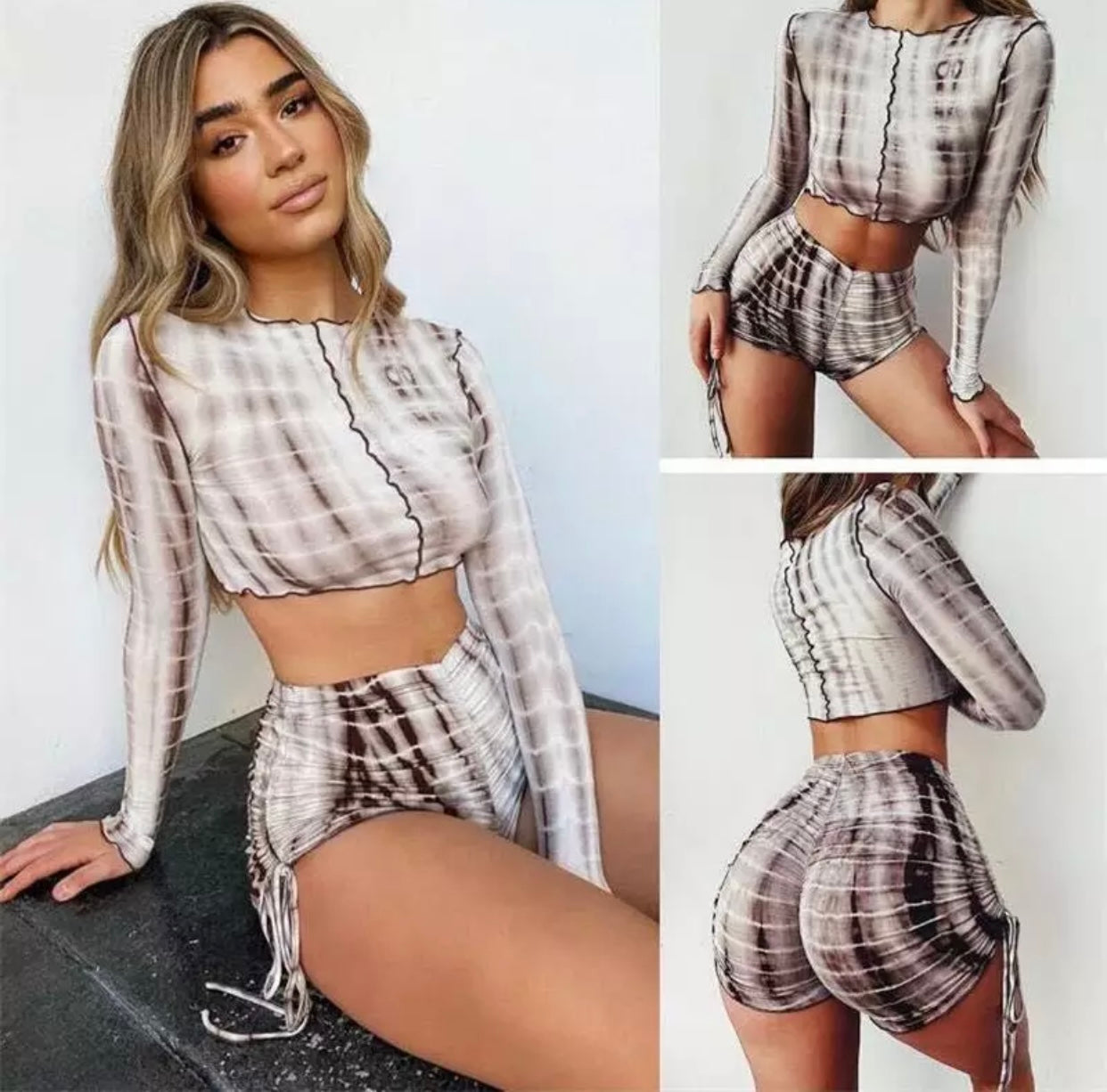 shot set unique tie shorts super stretchy and comfy lettuce edge trim at leg opening side seams can be ruched to make shorter or longer elastic waistband